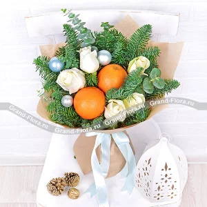 Снежное утро - корзина новогодняя из роз,хризантем и декора
