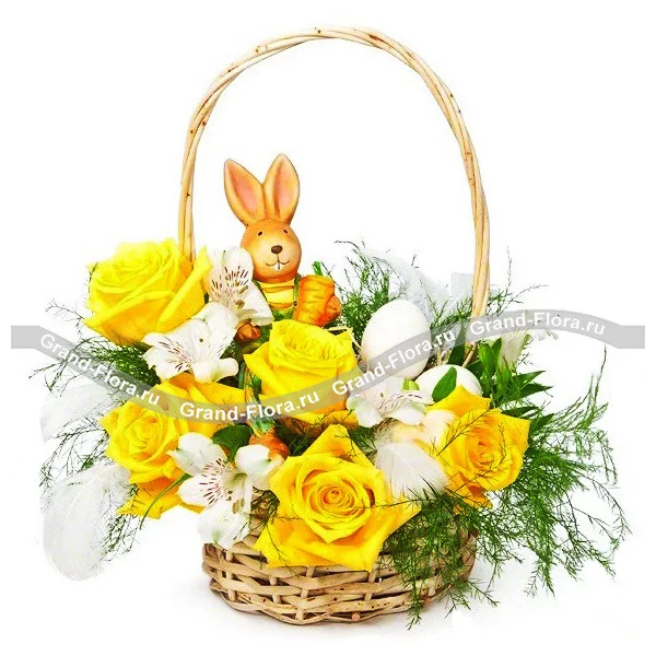 Стандартный: Роза желтая - 5 шт,альстромерия - 4 шт,декоративные яйца - 2 шт, декоративная зелень, декоративный заяц (мягкая игрушка, максимально похожая на фото) - 1 шт, корзина, оазис (на фото).