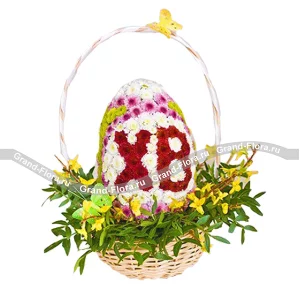 Нежный, солнечный, весенний букет из хризантем, роз, альстромерии и зелени – прекрасное дизайнерское решение. Оригинальность его заключается в дополнении из яиц, что подчеркивает тематику. Такая композиция станет отличным подарком близкому человеку на Пасху и позволит неординарно украсить праздничный стол. Станет залогом отличного весеннего настроения.