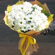 9 хризантем: хризантема кустовая белая (ромашковая) - 5 шт., хризантема кустовая зембла белая - 4 шт.,  рускус, фетр,крафт, бант.