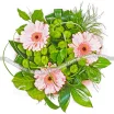 Уменьшенный: гербера розовая - 1 шт, хризантема кустовая зеленая - 3 шт, рускус, берграсс, розовый фетр. Примерный диаметр букета 25х25 см.