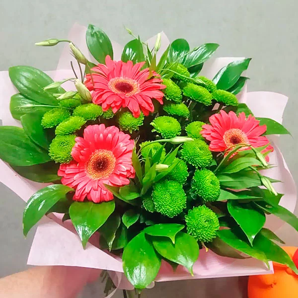 ДЕЛЮКС: гербера розовая - 9 шт, хризантема кустовая зеленая - 12 шт, рускус, берграсс, розовый фетр. Примерный диаметр букета 50х50 см.