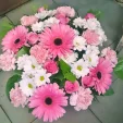 (на фото) гербера розовая - 3 шт, хризантема кустовая ромашковая - 3 шт, роза кустовая розовая - 1 шт, рускус, упаковка, лента. Примерный диаметр букета 30х30 см.