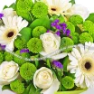 роза белая - 15 шт, гербера белая - 9 шт, хризантема кустовая зеленая - 10 шт, статица - 7 шт, салал, фетр из двух слоев - зеленый и фиолетовый, лента. Примерный размер: 45Х45 см.