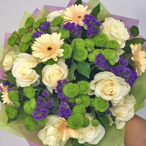 (на фото) роза белая - 5 шт, гербера белая - 3 шт, хризантема кустовая зеленая - 3 шт, статица - 2 шт,салал, фетр из двух слоев - зеленый и фиолетовый, лента. Примерный размер: 25Х25 см.