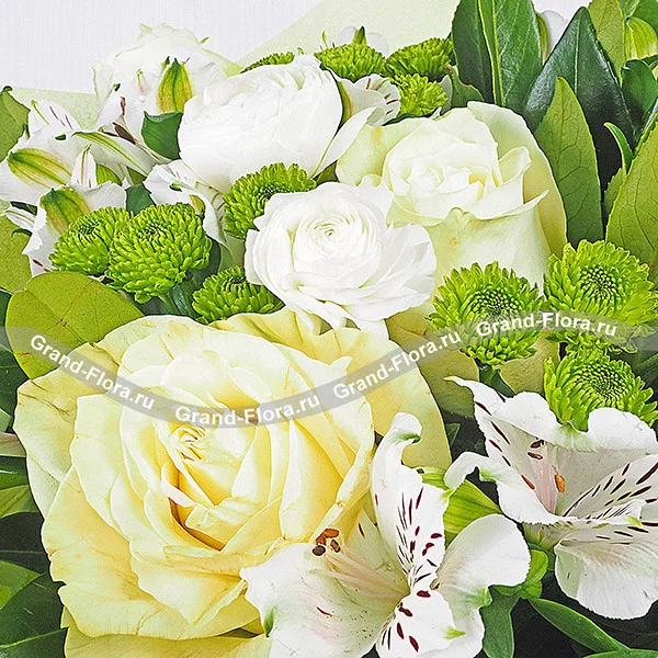 ДЕЛЮКС: роза белая - 15 шт., эустома белая - 10 шт., альстромерия белая - 11 шт., хризантема кустовая зеленая - 11 шт., фетр зеленый.