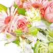 роза розовая - 7 шт., гербера розовая - 7 шт., лилия белая - 2 шт., эустома белая - 4 шт., альстромерия белая - 5 шт., фетр розовый, крафт, лента розовая. Примерный размер: 35Х35 см.