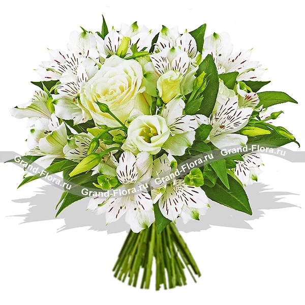 ЛЮКС: роза белая - 5 шт., альстромерия белая - 9 шт., эустома белая - 9 шт., салал, сетка зеленая. Примерный объем букета 40х40 см.