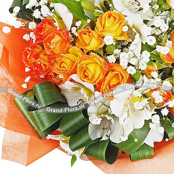 ДЕЛЮКС: роза кустовая оранжевая - 15 шт, альстромерия белая - 14 шт, гипсофила - 7 шт, листья апсидистры загнутые - 9 шт, фетр оранжевый.