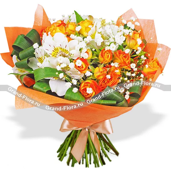 Стоит лишь только взгянуть на этот букет и сразу же поднимается настроение, а все по тому что в состав букета входят насыщенно-оранжевые кустовые розочки, которые прерасно сочетаются с нежным цветком альстромерии. Такой букет можно преподнести своей второй половинке на день рождения или просто удивить ее без повода. Радовать цветочное творение будет не меньше 5 дней*.