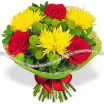 Уменьшенный: роза красная - 3 шт, хризантема одноголовая желтая - 2 шт, хризантема кустовая зеленая - 1 шт, фетр зеленый.