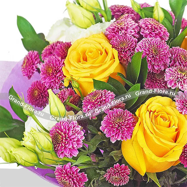 Букет выполнен из ярких желтых роз, с яркими акцентами фиолетовой кустовой хризантемы сантини и кульминацией в виде эустомы, свободно расположенной по периметру букета. Завершает композицию фиолетовый фетр. Диаметр букета от 25 см до 45 см,в зависимости от выбранного Вами варианта букета. Высота букета от 40 см. Обращаем Ваше внимание, что состав и оформление букета могут отличаться.
