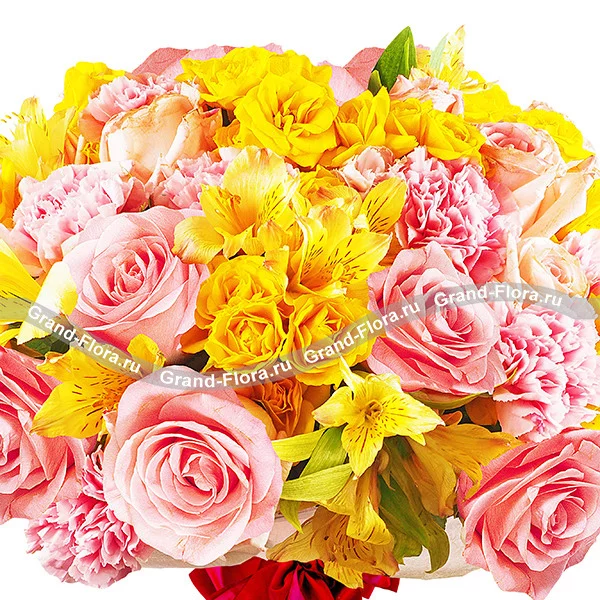 Стандартный (на фото): роза розовая - 11 шт., роза кустовая желтая - 3 шт., альстромерия желтая - 3 шт., гвоздика одноголовая розовая - 9 шт, фетр розовый, бант розовый, + коробка конфет в подарок.
