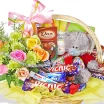 ЛЮКС: роза (микс) - 5 шт., хризантема (зеленая) - 2 шт., декоративная зелень, оазис, корзина средняя, желтый фетр, розово-зеленый бант, мишка "Teddy"(возможна замена на плюшевого мишку) - 1 шт., коробка конфет "Alpen Gold" (163 г.) - 1 шт., шоколад Dove - 1 шт., Яйцо "Kinder" - 1 шт., Snikers (маленький) - 2 шт., Picnic - 1 шт., KitKat - 1 шт., Twix - 1 шт., Kinder Chocolate MAXI - 1 шт..