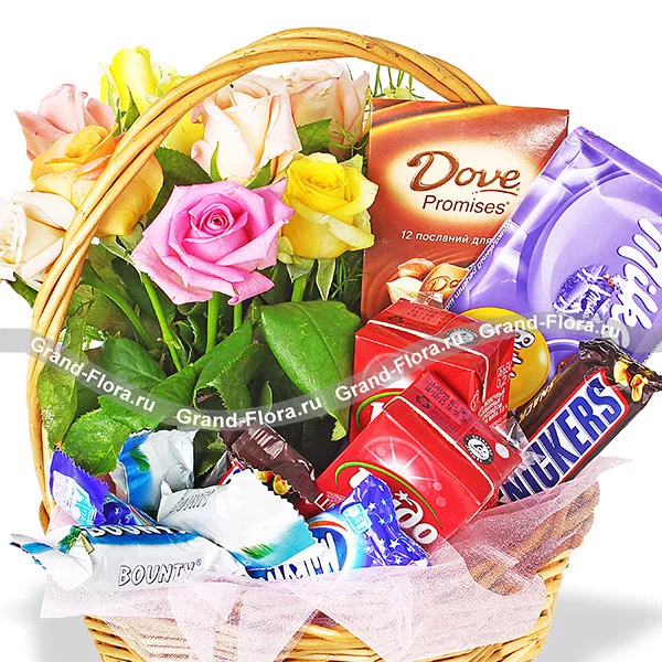 Стандартный: шоколад "Milka" - 1 шт., Snikers - 2 шт., шоколад Чудо - 2 шт., шоколад DOVE (12 пожеланий) - 1 шт., Milky Way - 3 шт., Bounty - 3 шт., розы (20 см) - 9 шт., оазис, декор, корзина малая.