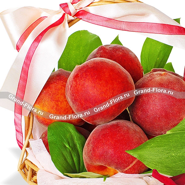 Стандартный: роза красная - 1 шт., рускус - 2 шт., персики - 1,5 кг, фетр розовый, корзина средняя, бант бело - красный.