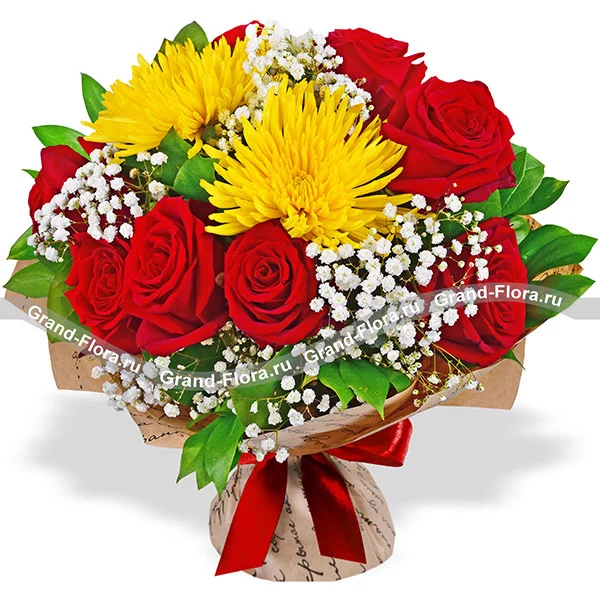 Уменьшенный: роза красная (50 см) - 5 шт., хризантема одноголовая (желтая) - 2 шт., гипсофила - 1 шт., крафт, лента.