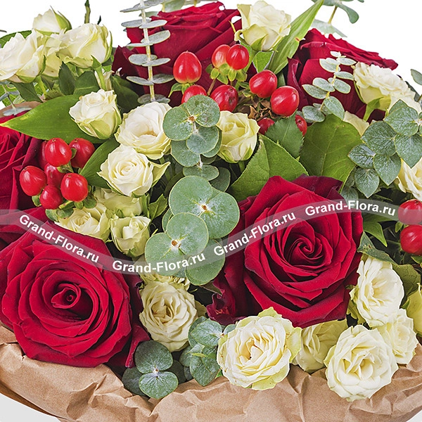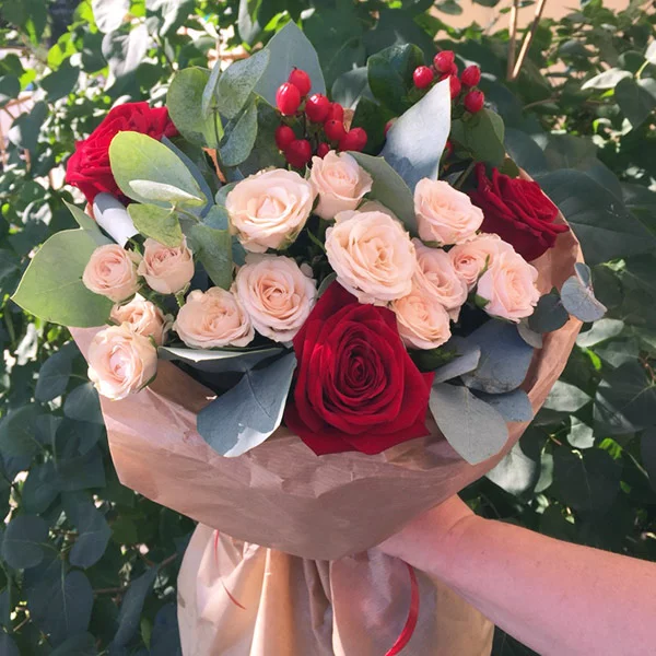 ЛЮКС: роза красная - 9 шт., роза кремовая кустовая - 4 шт., эвкалипт - 4 шт., гиперикум - 3 штт( Возможна замена на иные ягоды)., упаковка, лента. Примерный размер: 35Х35 см.