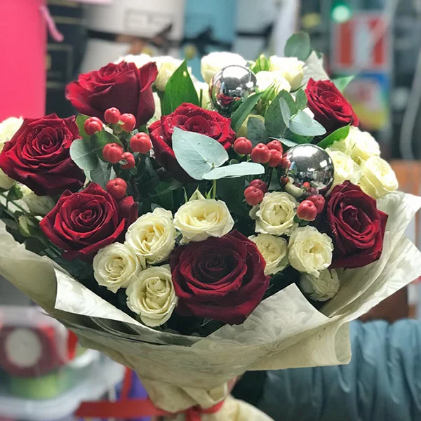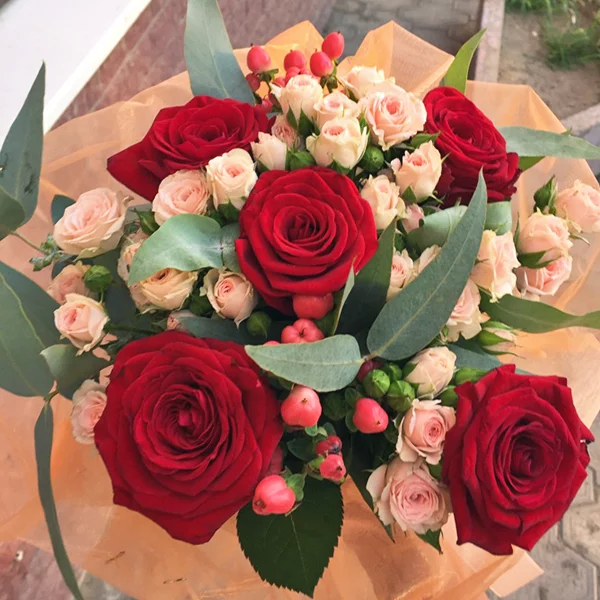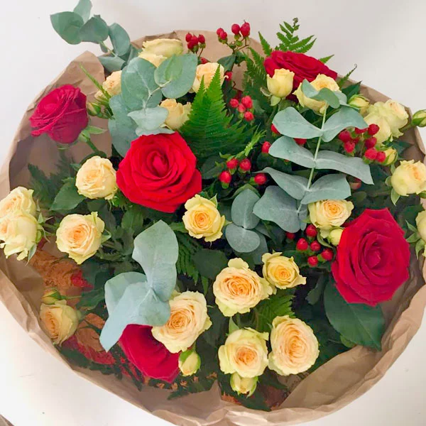 ДЕЛЮКС: роза красная - 11 шт., роза кремовая кустовая - 10 шт., эвкалипт - 5 шт., гиперикум - 4 шт.т( Возможна замена на иные ягоды), упаковка, лента. Примерный размер: 45Х45 см.