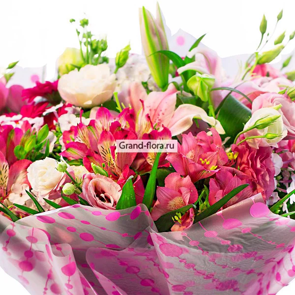 Нежно-розовый букет, с неповторимым ароматом, станет замечательным подарком на любое торжество. Богатая композиция из свежих цветов альстромерии, лилии и эустомы, удивит даже самого требовательного покупателя. Ураган нежности унесет вас в мир мечтаний и любви, прямо у вас дома или в офисе.