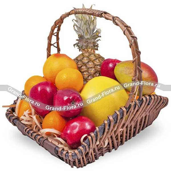 Стандартный: апельсины - 1 кг., мандарины - 1 кг., яблоки красные - 1 кг., манго - 2 шт., помело - 1шт., ананас - 1 шт., декор, корзина.