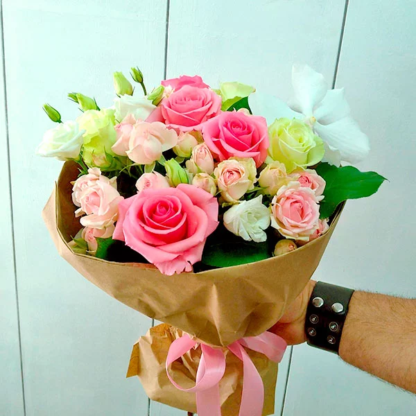 Букет составлен из роз белых оттенков сорта Мондиаль, розовых роз Ангажемент и кустовых роз розового цвета. Дополнена композиция белой эустомой и прекрасной розовой орхидеей, которая в давние времена,  считалась цветами аристократов, а окраски могли символизировать особое отношение: так розовая орхидея, используемая в композиции «говорит» о нежных чувствах. Довершает композицию декоративная зелень и стильная крафтовая упаковка, перевязанная лентой в тон цветов.