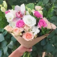 розовая орхидея (возможна замена на белую, бело-розовую или зеленую) - 3 шт., роза белая - 7 шт., роза розовая - 8 шт., роза кустовая розовая - 5 шт., эустома белая (возможна замена на фиолетовую или розовую)- 4 шт., декоративная зелень, упаковка крафт, лента розовая.Примерный размер: 35Х35 см.