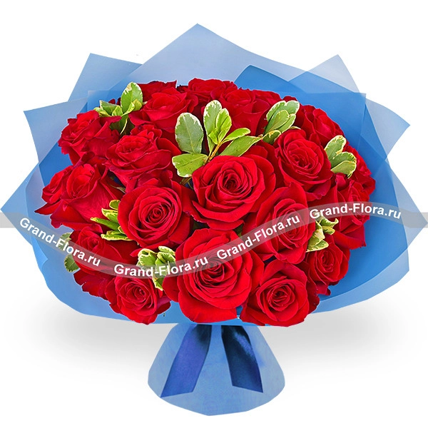 25 роз: роза красная - 25 шт., питтоспорум - 7 шт., упаковка, лента.
