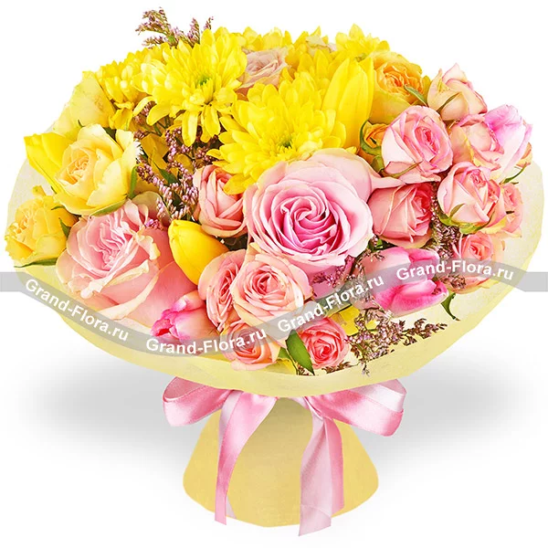 Композиция из желтых хризантем и кустовых роз, цвета самого солнца, дополненная ранними тюльпанами сорта Гольден Апельдорн, имеющими насыщенный желтый оттенок, эта палитра умело разбавлена нежнейшими кустовыми розами цвета розового заката. Завершается букет декором из лимониума и упаковкой из светлого фетра и лентой в цвет розам, оттеняющей всю красоту цветов. Высота букета до 40 см, диаметр зависит от выбранного Вами варианта букета. Обращаем Ваше внимание, что состав и оформление букета может отличаться.