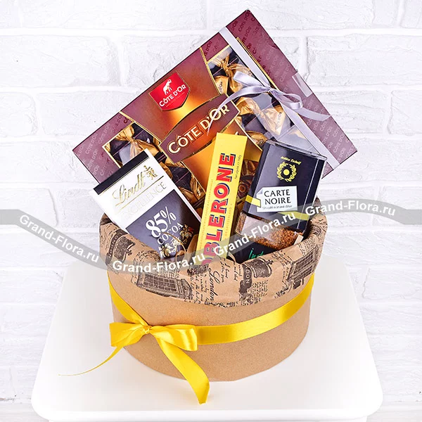 Стандартный: шоколад "Lindt Lindor" - 100 гр., шоколад "Toblerone" - 1 шт., кофе "Carte Noire" - 95 гр., шоколадные конфеты "Cote D'OR" - 210 гр., коробка, лента.