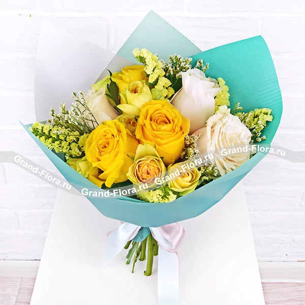 Стандартный: роза белая - 4 шт., роза желтая - 4 шт., роза кустовая желтая - 1 шт., роза кустовая белая - 2 шт., декоративная зелень, упаковка, лента. *Возможна замена кустовой розы на один оттенок (только белые или только желтые),декоративная зелень может отличаться от фото.