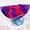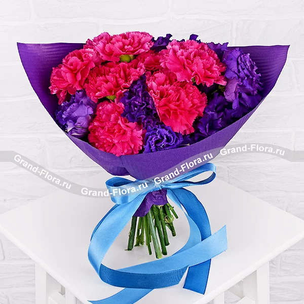 Люкс: гвоздика розовая - 13 шт., эустома синяя - 10 шт., упаковка, лента.