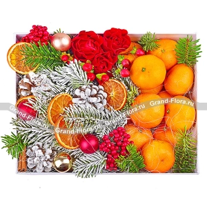 Стандартный(на фото): роза кустовая розовая - 7 шт., новогодние игрушки - 8 шт., ель, оазис, коробка.