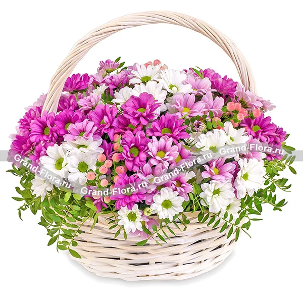 хризантема кустовая ромашковидная белая - 3 шт., хризантема кустовая ромашковидная розовая - 2 шт., хризантема кустовая ромашковидная фиолетовая - 1 шт., гиперикум - 1 шт., декоративная зелень, оазис, корзина малая.