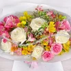 Роза белая – 5 шт., роза розовая –5шт., альстромерия желтая – 4 шт., альстромерия розовая –5 шт., лимониум белый– 3 шт., упаковка, лента.