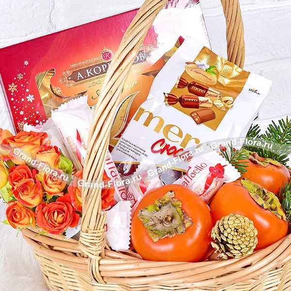 Сладкий праздник - корзинка с хурмой, розами и сладостями