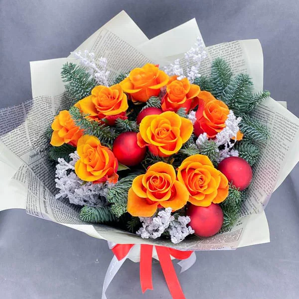 Этот новогодний букет из оранжевых роз просто потрясающий! Я никогда не думала, что оранжевые розы могут быть такими яркими и жизнерадостными. Они привнесли в мой дом атмосферу праздника!