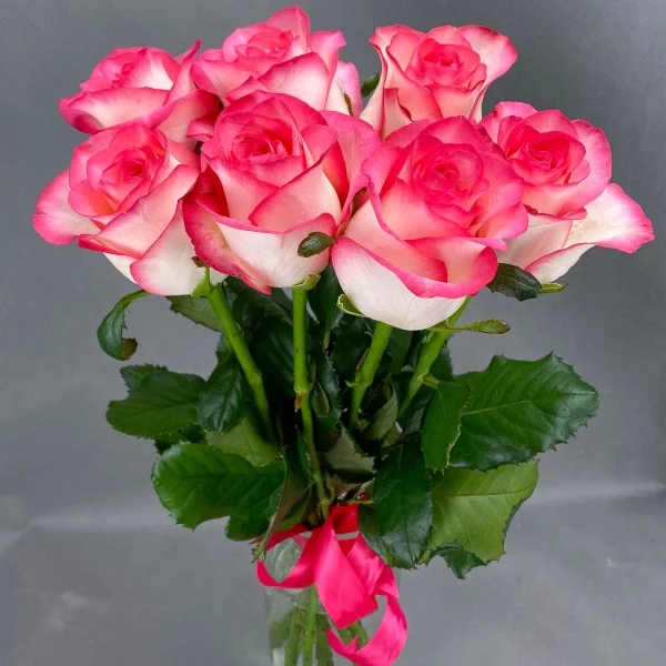 Роза розовая 50 см - 9 шт, упаковка, лента.